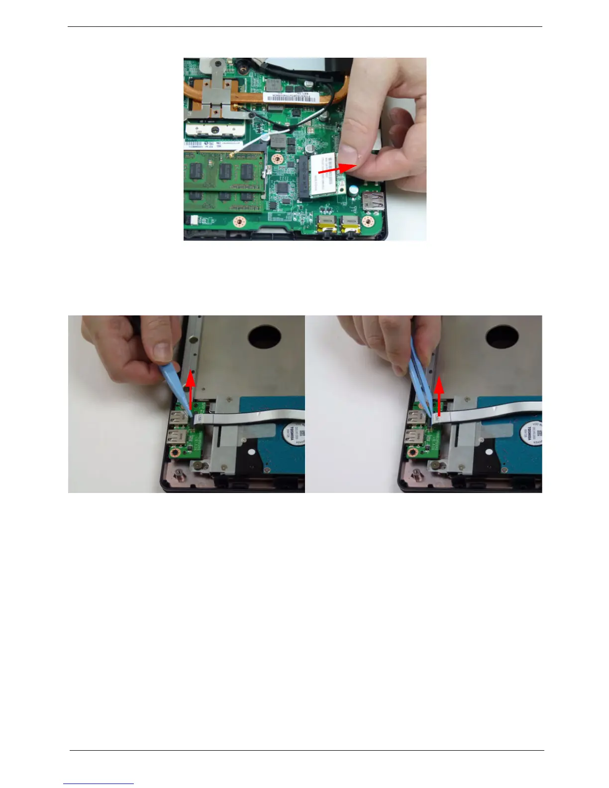 2. Unlock and disconnect the USB FFC from the USB board. Repeat for the mainboard connector.