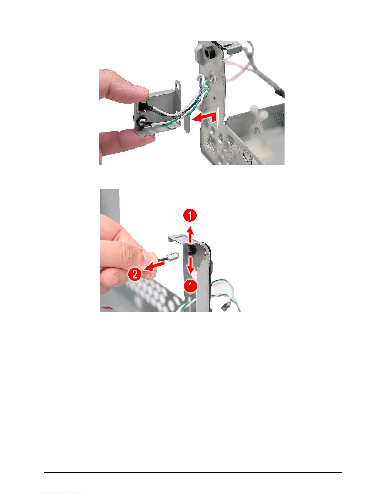 14. Release the two locking tabs (1) and gently pull the HDD LED cable out (2).