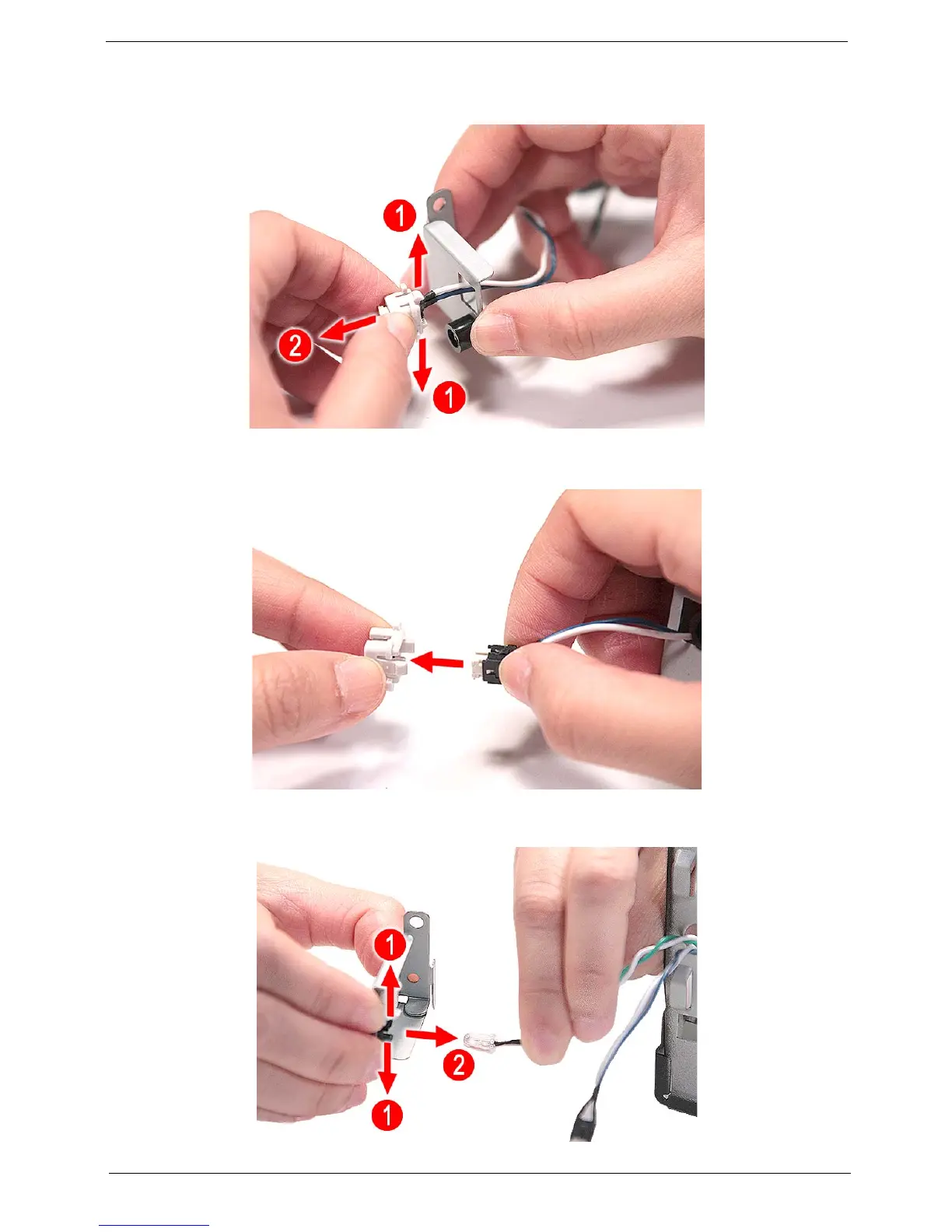 16. Release the two locking tabs (1) and gently pull the power LED cable out (2).