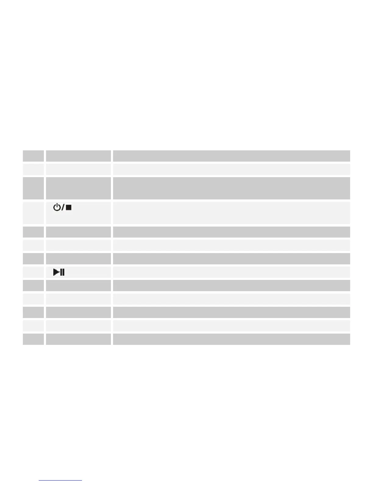 Power on/off; Stop playback or recording; Open music/movie/FM Radio/Voice