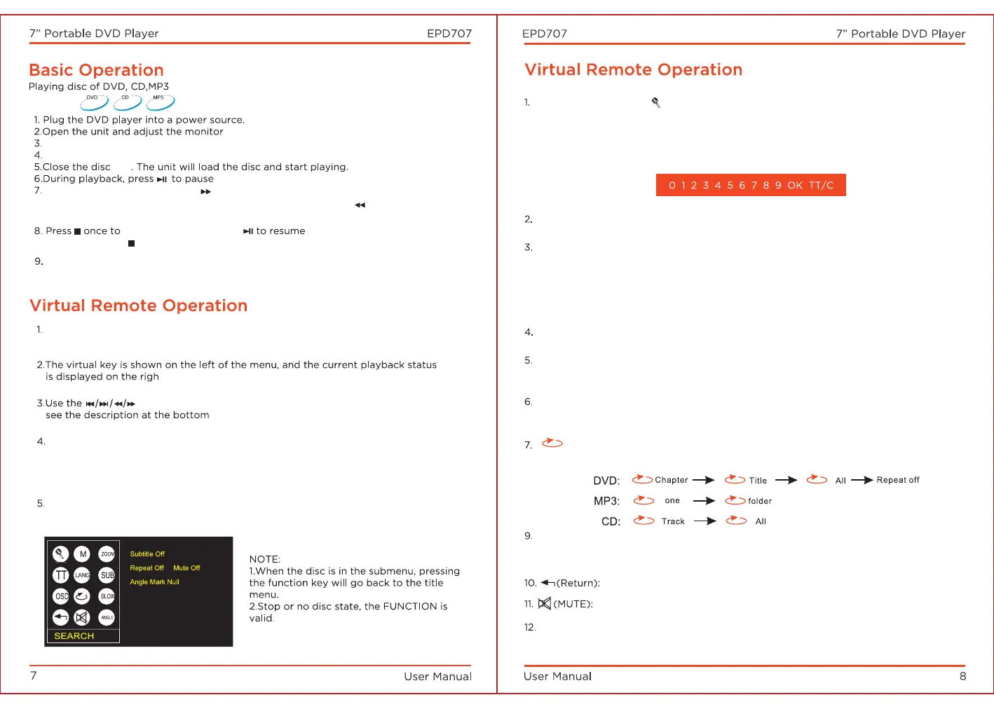 (Repeat): When playing disc of DVD/CD/MP3, you can change the repeat style by pressing