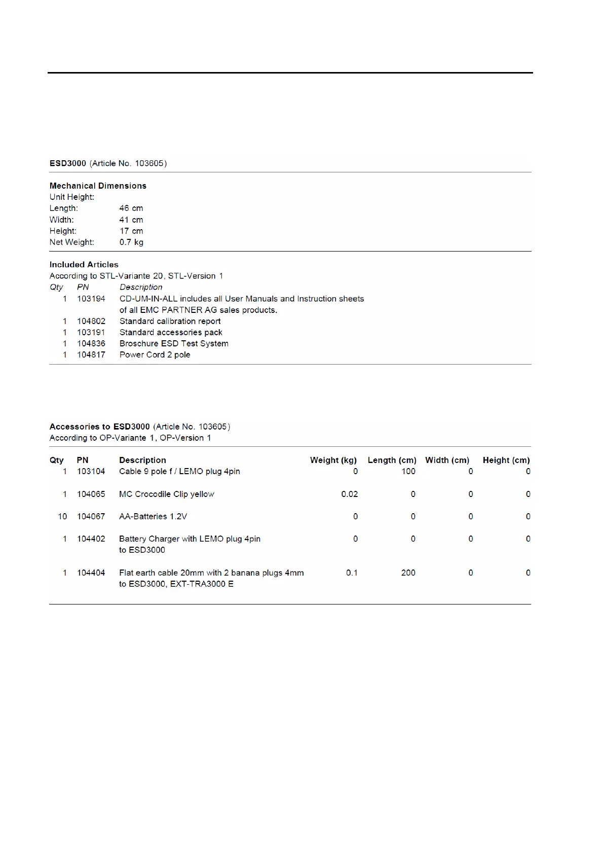 EMC-PARTNER ESD3000 - Accessories, Dimensions; Included Articles, Dimensions; Standard Accessories