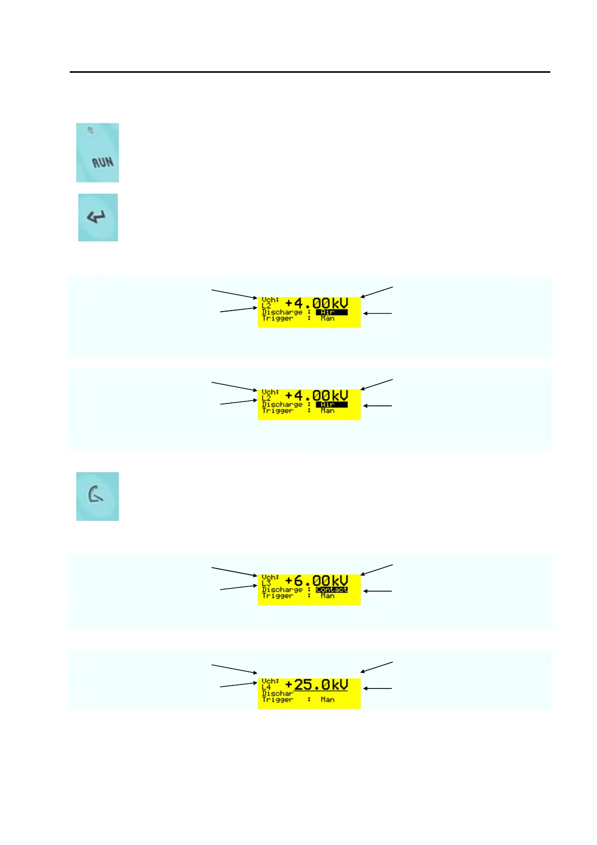 • The blinking light above the „RUN“ button indicates „High Voltage ON“