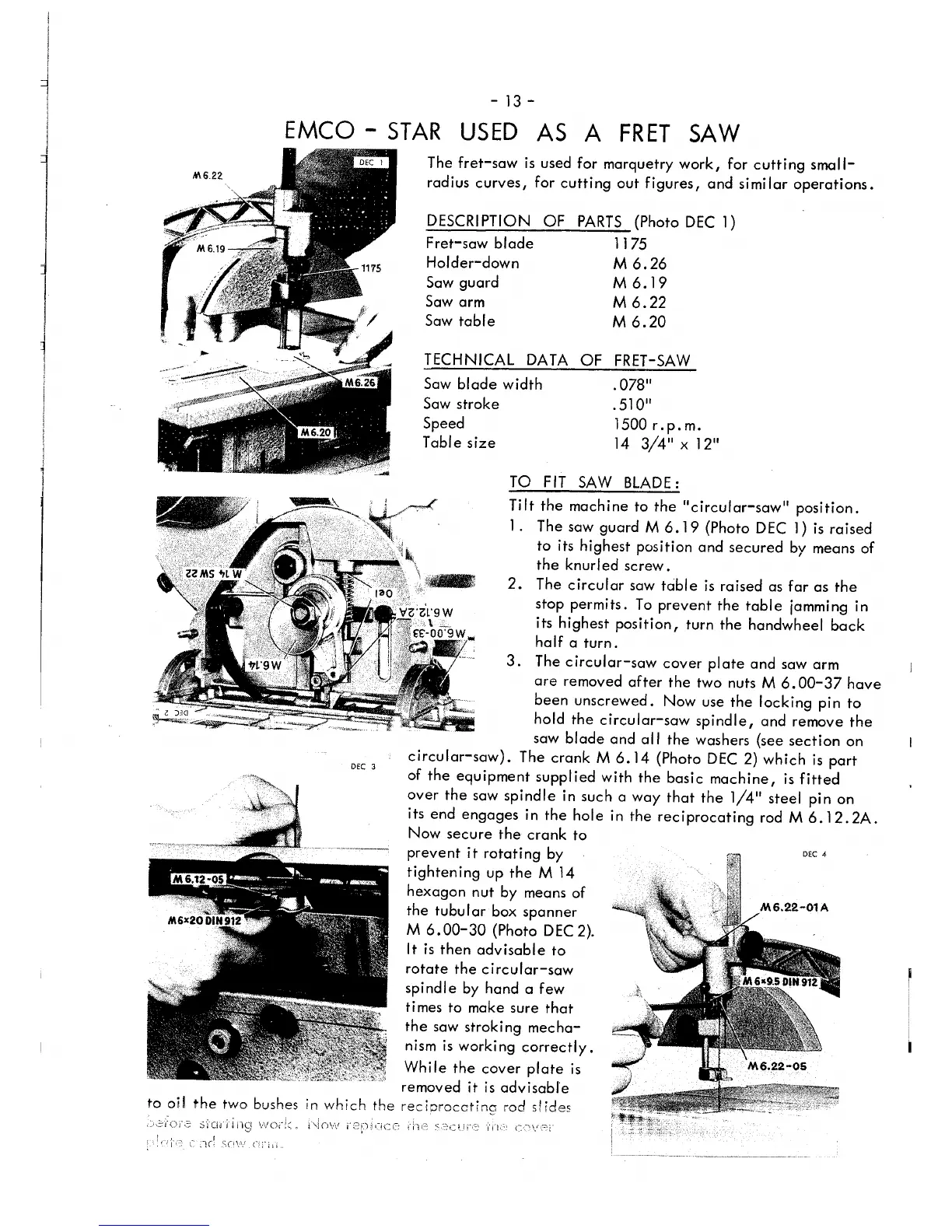 Emco rex - Technical Data; To Fit Saw Blade