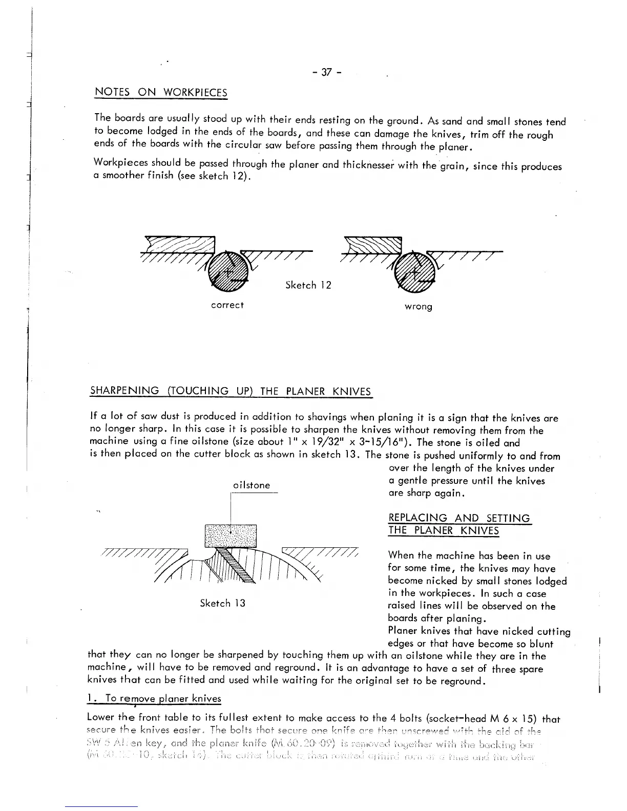 Emco rex - Notes on Workpieces; Sharpening the Planer Knives; Replacing and Setting the Planer Knives; To Remove Planer Knives