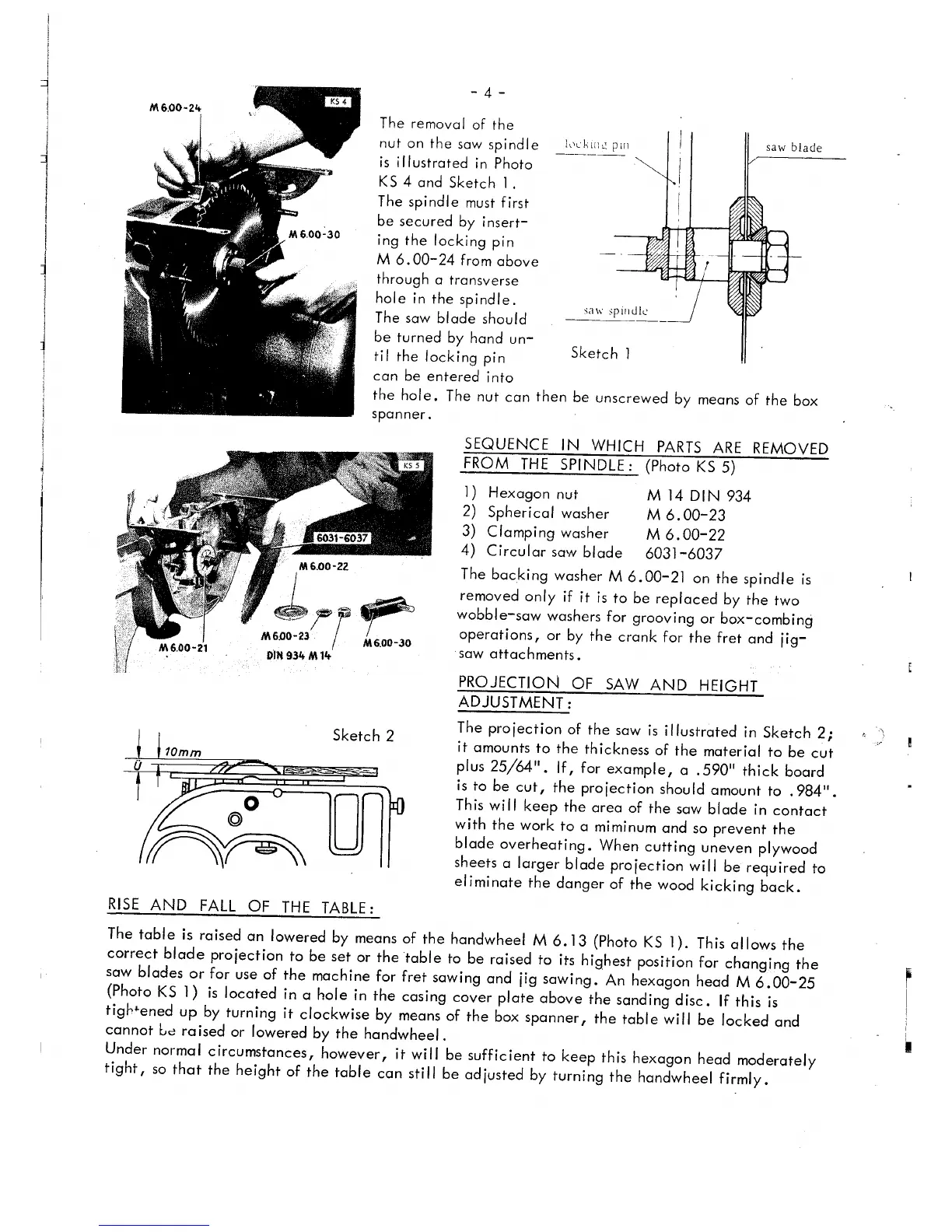 Emco rex - Sequence in Which Parts Are Removed from the Spindle; Projection of Saw and Height Adjustment; Rise and Fall of the Table