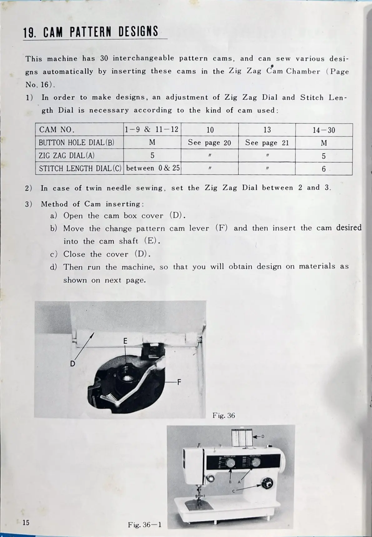 b) Move the change pattern cam lever (F) and then insert the cam desired