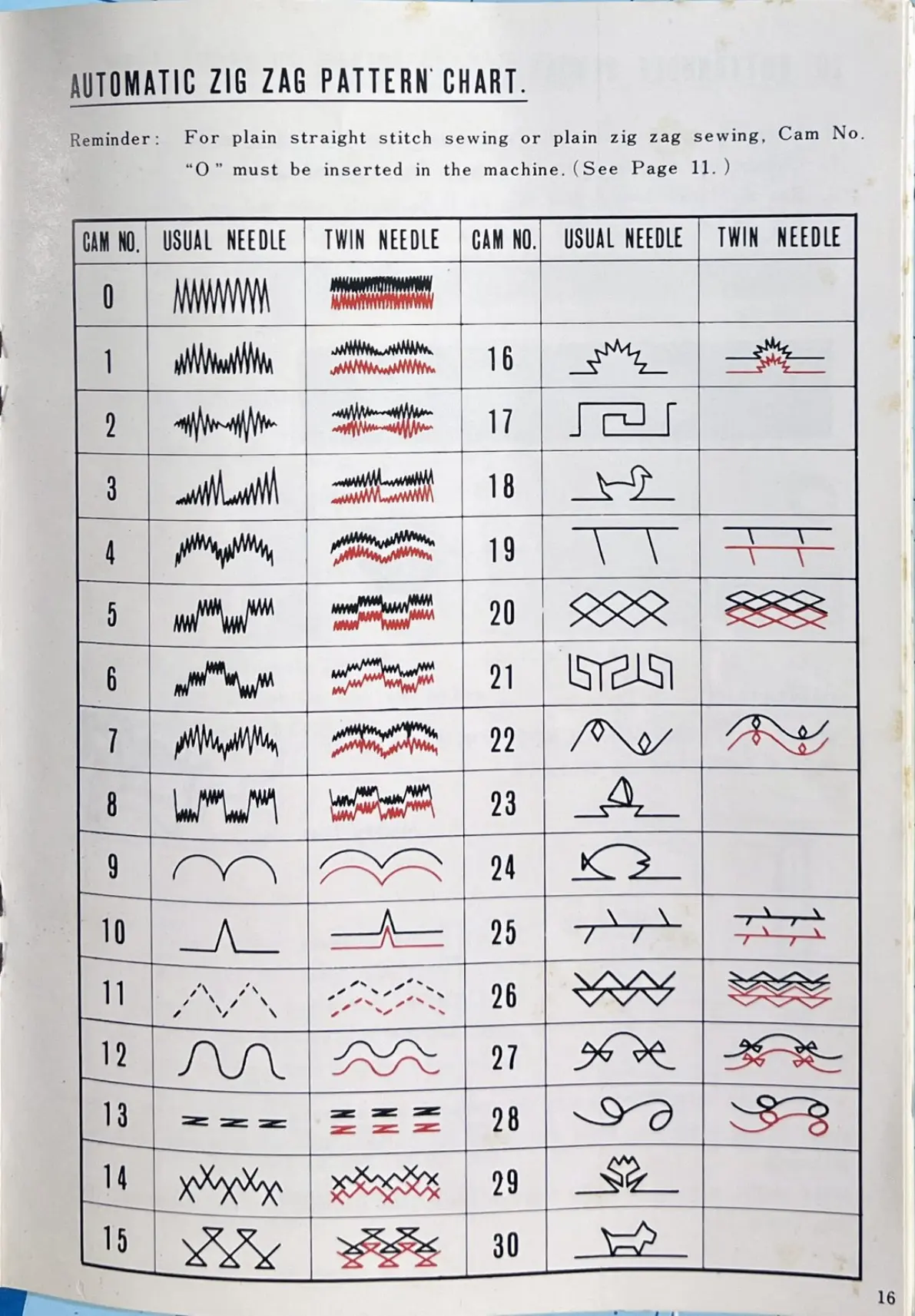 Reminder: For plain straight stitch sewing or plain zig zag sewing, Cam No.
