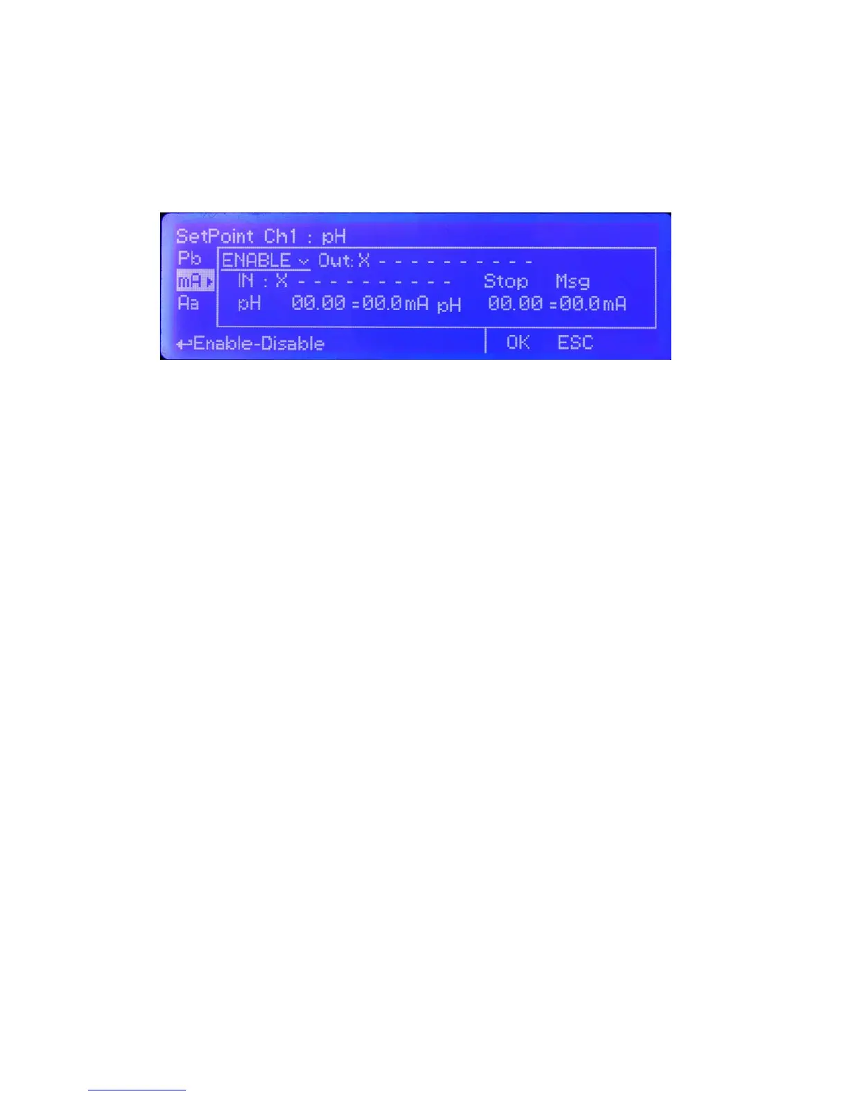These elds require to set two pH values with mA for a proportional working mode. This mode let the instrument to