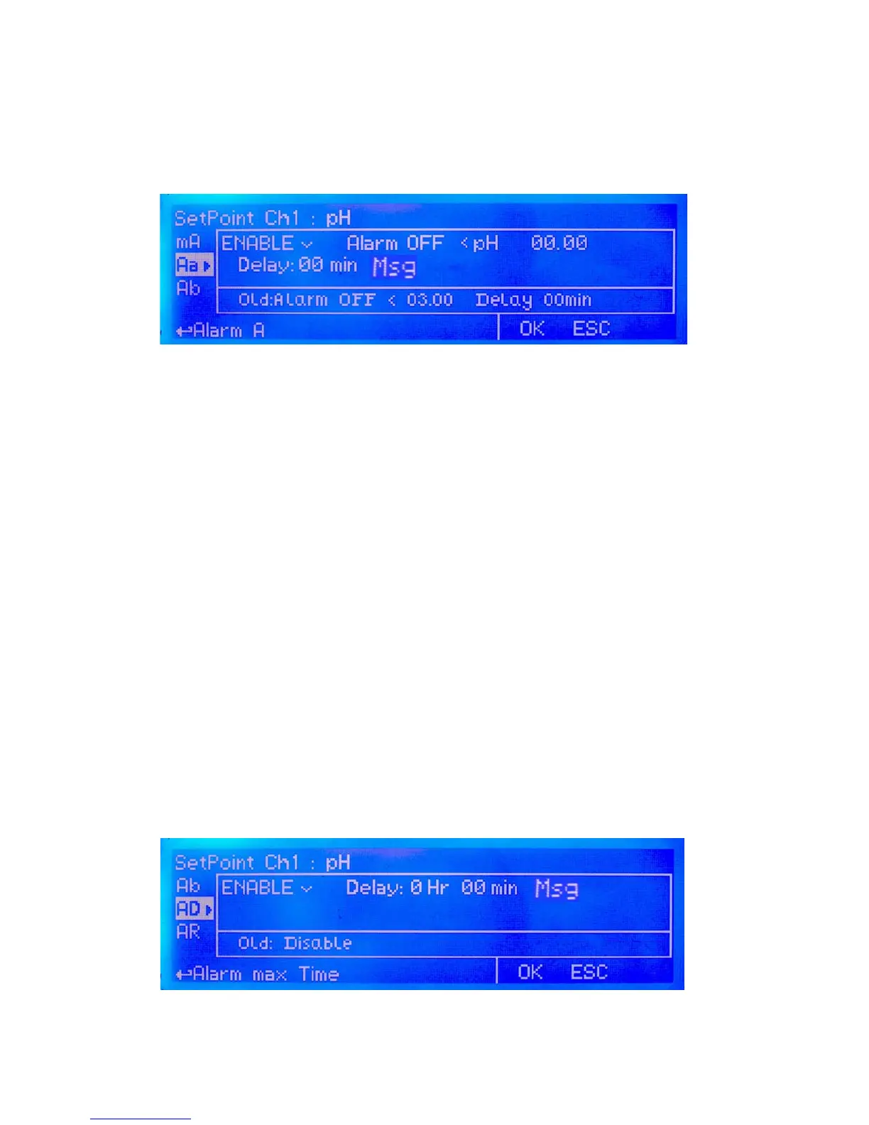 Using Aa and / or Ab is possible to set a visual alarm with delay for values ≥ or ≤ than set value. Once that Aa or Ab