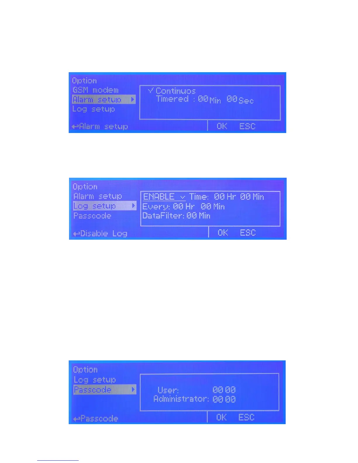 to exit without saving. Administrator can also set passcode for “User” with limited access (no instrument reset / mA