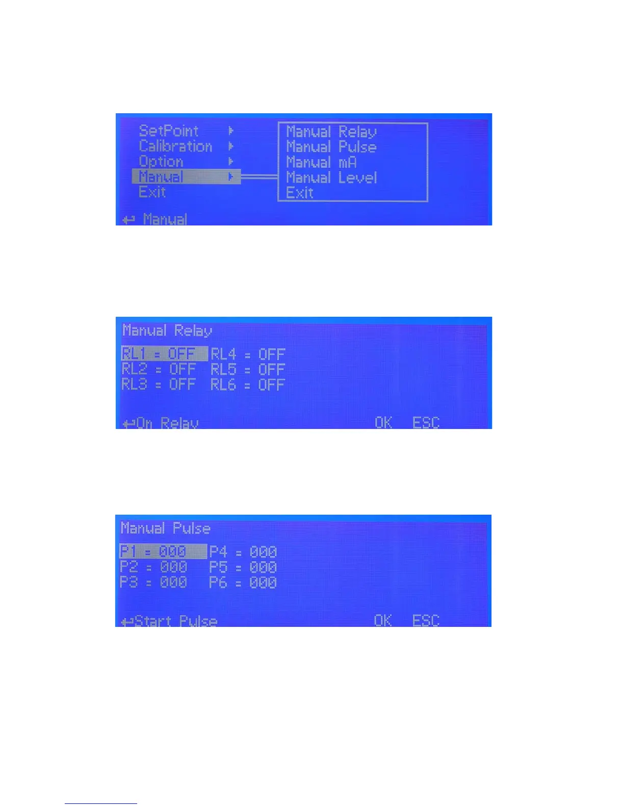 “Manual Relay” will activate “setpoints outputs” (see page 4). Exiting from manual mode will revert selected output to its