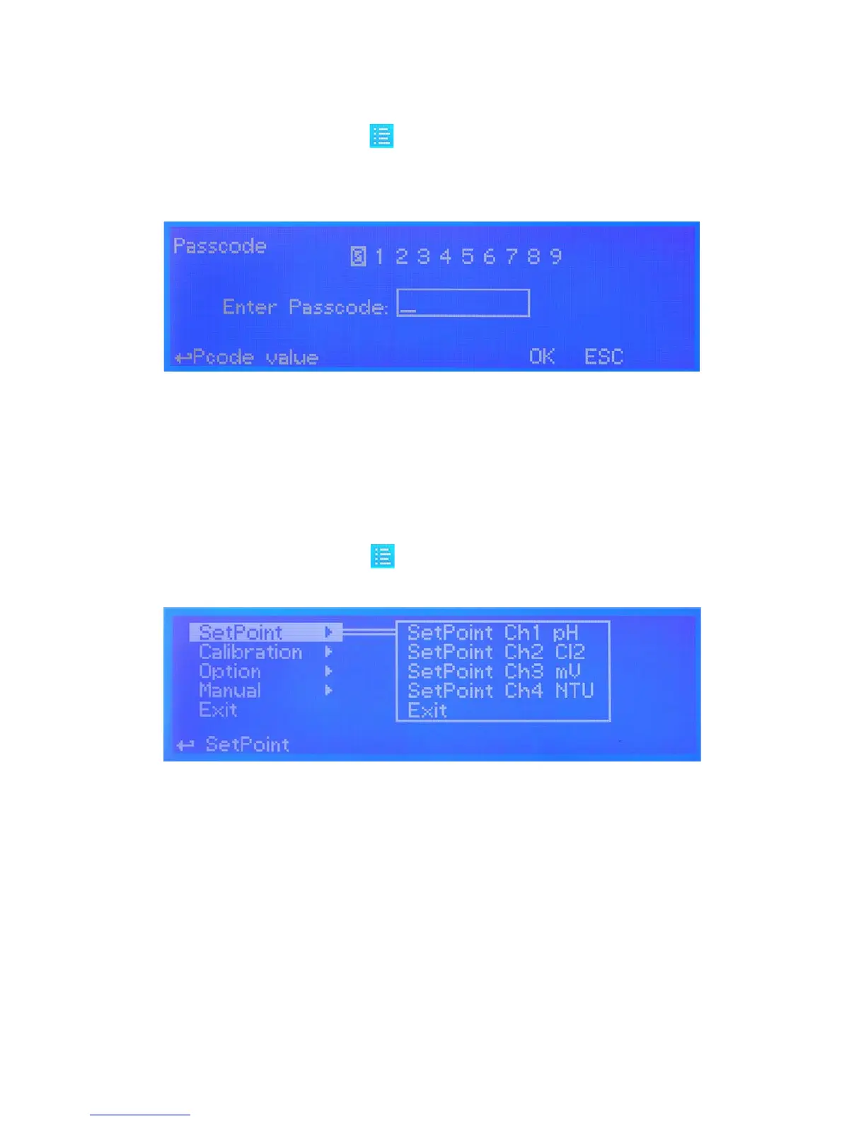 Note: This is a passcode protected area. For this reason every time this menu is reached, the instrument will ask for a