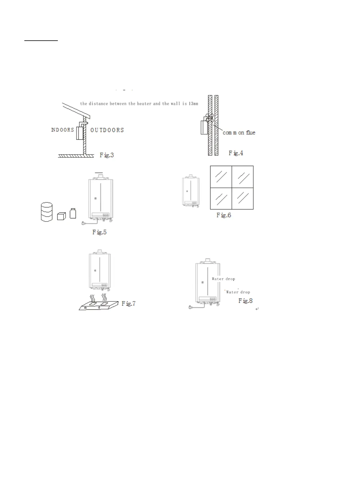 ● Don’t install the heater above the gas stoves or other heat sources. (Fig. 7.)