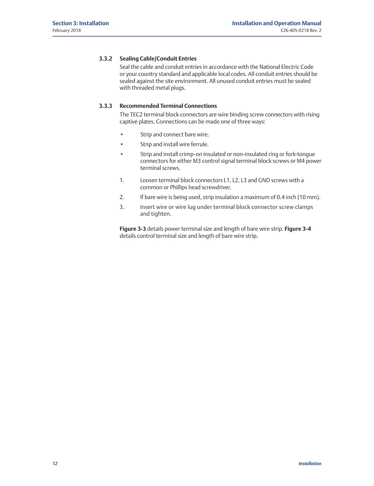 Figure 3-3 details power terminal size and length of bare wire strip. Figure 3-4
