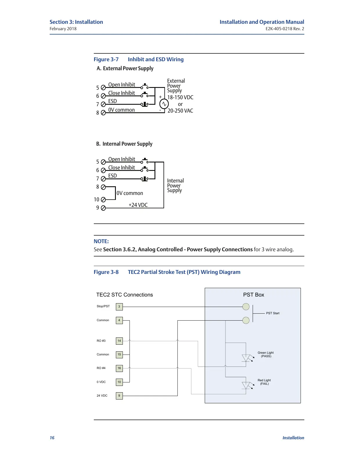 Emerson Bettis TEC2 - Figure 3-7 Inhibit and ESD Wiring; Figure 3-8 TEC2 PST Wiring Diagram