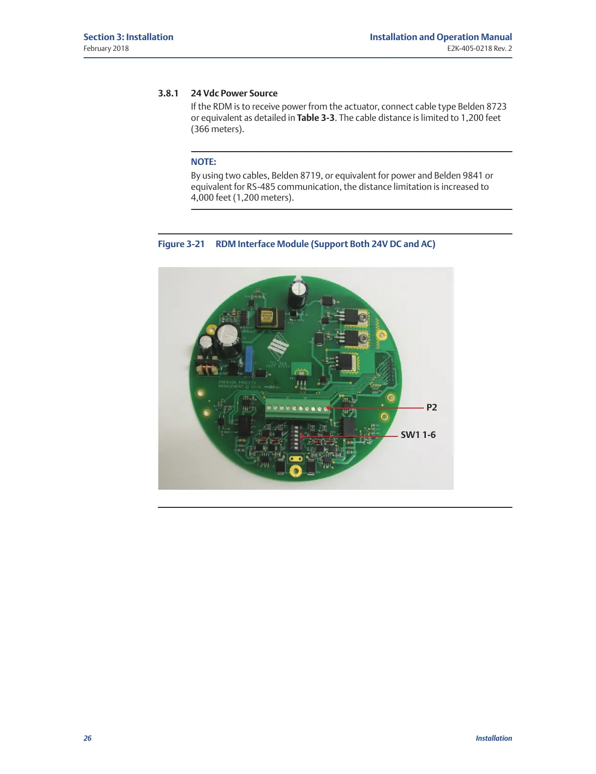 If the RDM is to receive power from the actuator, connect cable type Belden 8723