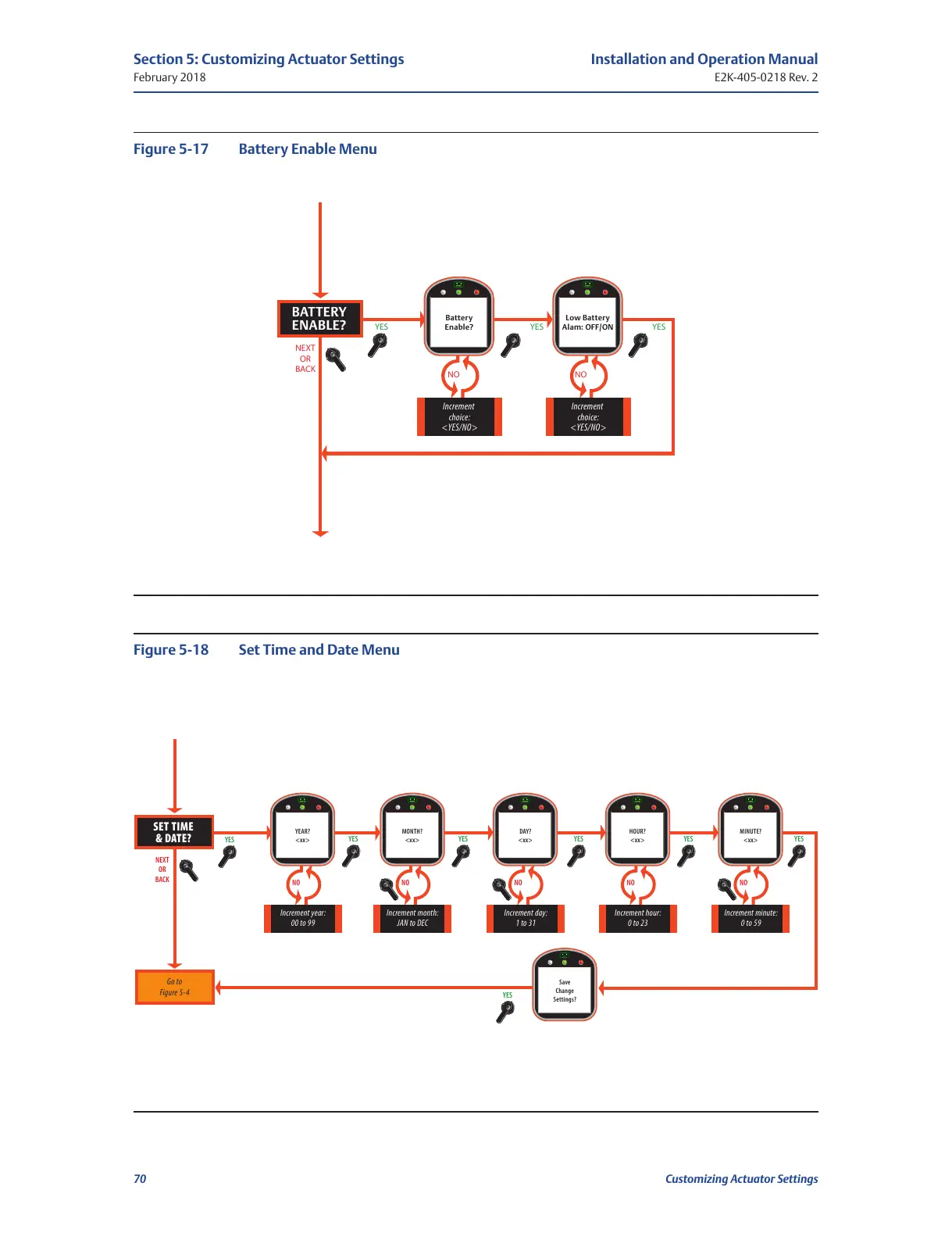 Emerson Bettis TEC2 - Figure 5-17 Battery Enable Menu; Figure 5-18 Set Time and Date Menu