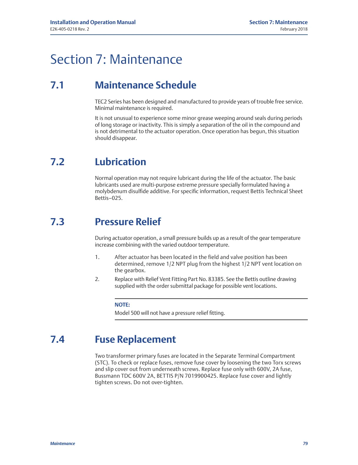 2. Replace with Relief Vent Fitting Part No. 83385. See the Bettis outline drawing