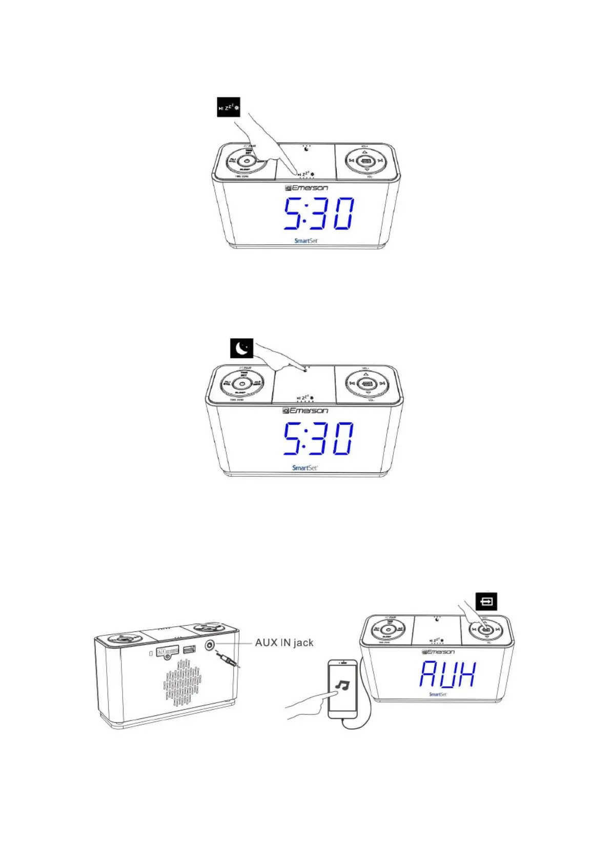 Press SOURCE button until “AUX” appears on LED display, connect your audio or mobile device and
