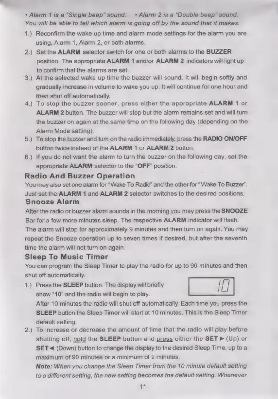 Emerson CKS9051 - Alarm Sounds and Sleep Timer; Wake To Buzzer and Snooze; Sleep To Music Timer