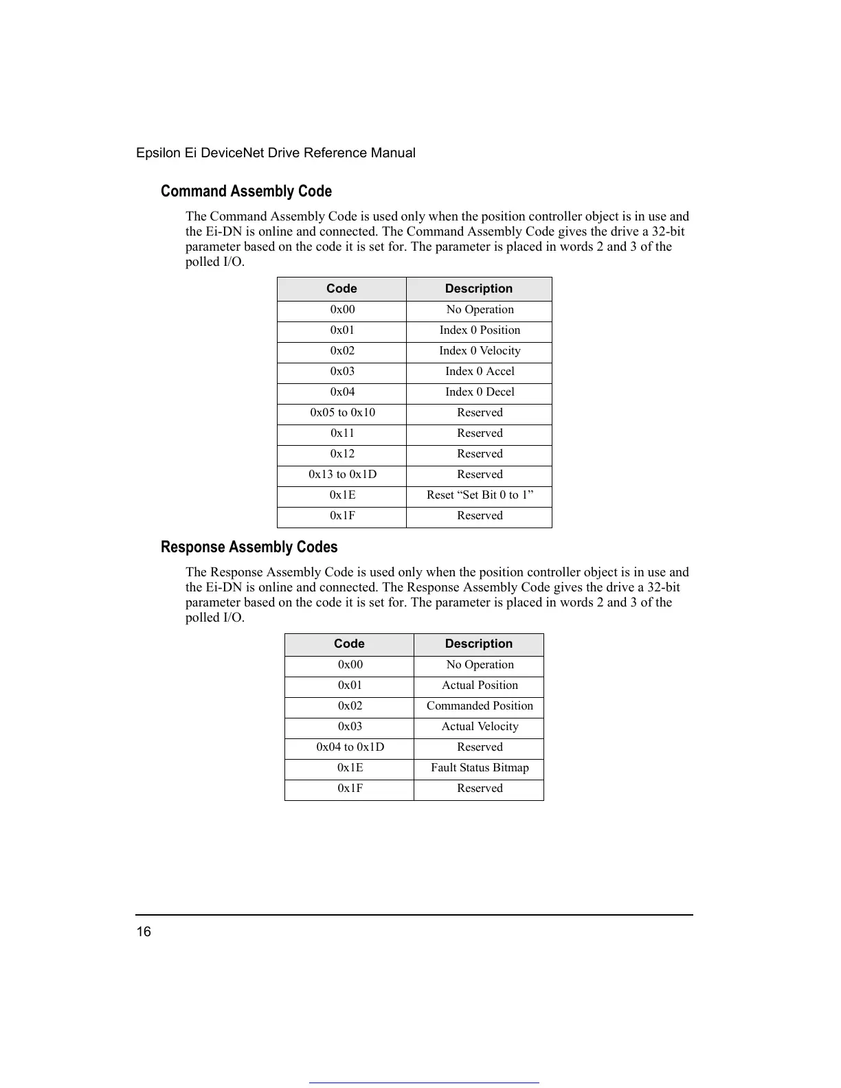 The Response Assembly Code is used only when the position controller object is in use and
