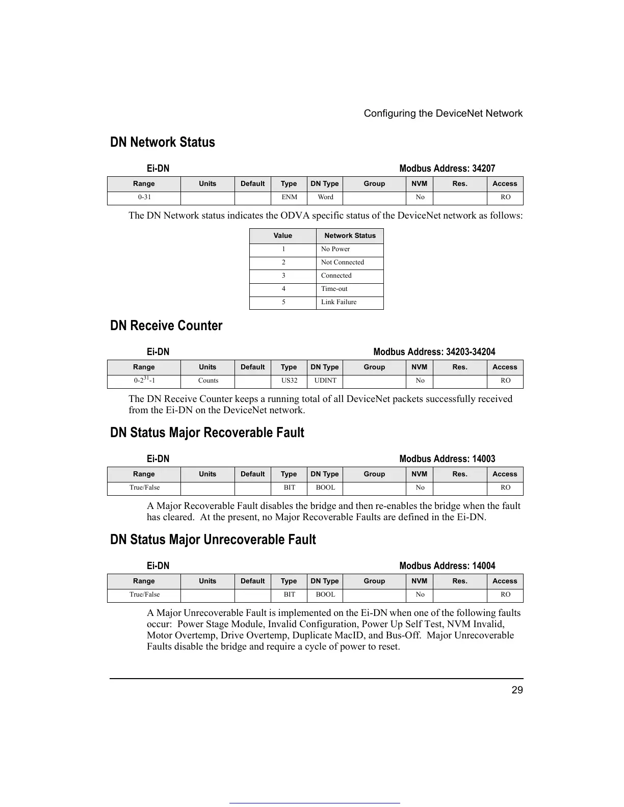 The DN Network status indicates the ODVA specific status of the DeviceNet network as follows: