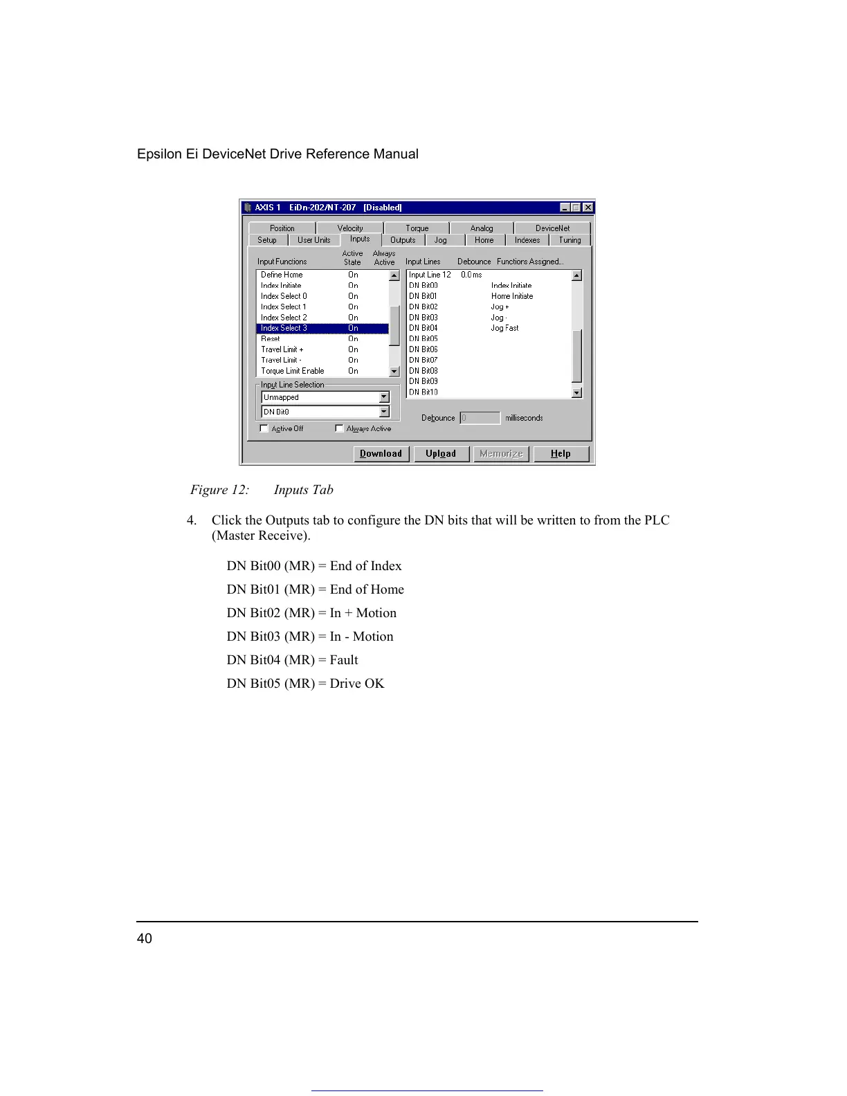 4. Click the Outputs tab to configure the DN bits that will be written to from the PLC