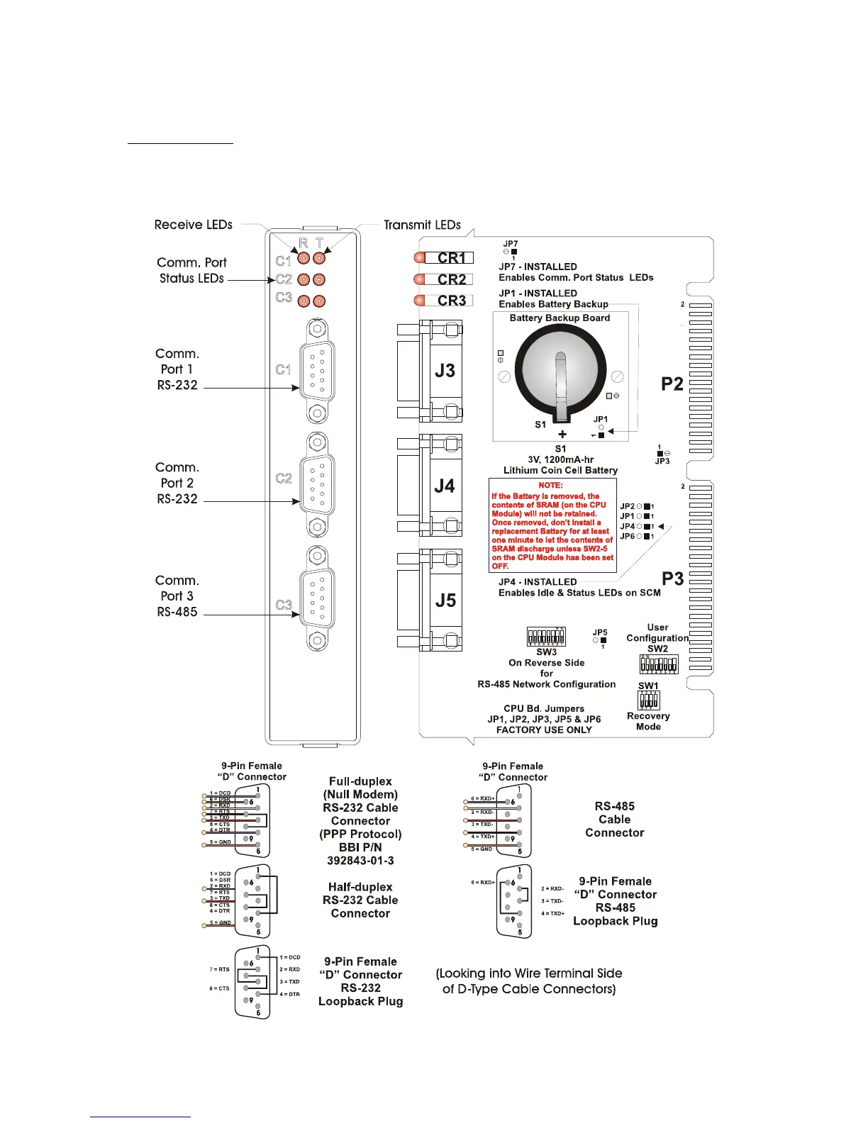 COM3 - Port 3: CPU Bd. J5, PC/AT 9-Pin Male D-Sub - RS-485 - Supported by SW3