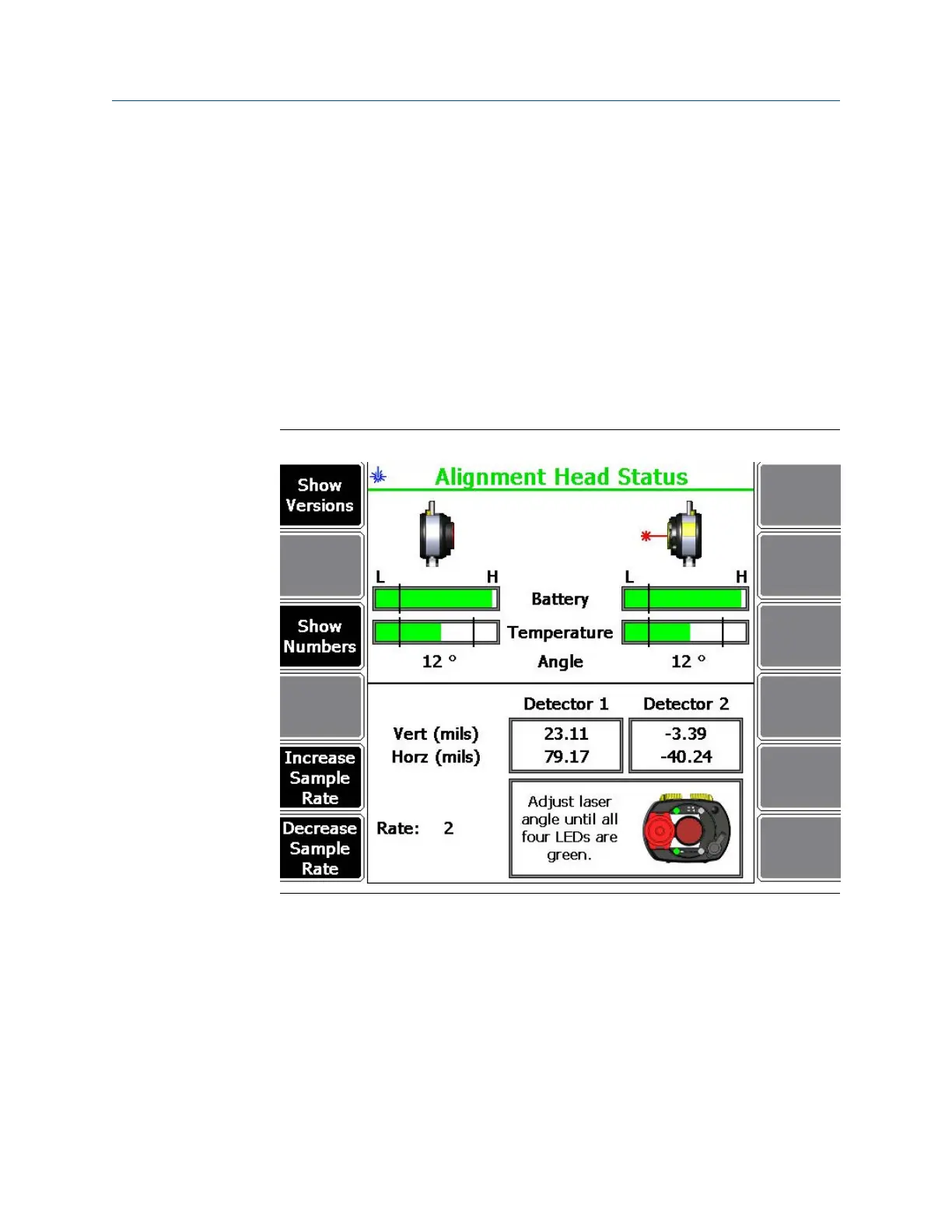 for the laser and sensor are shown on the upper half of the analyzer screen.