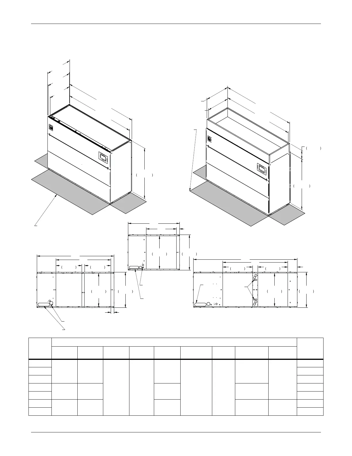 Figure 4-1 Cabinet and floor-planning dimensions, downflow, CW026 – CW084 with EC fans