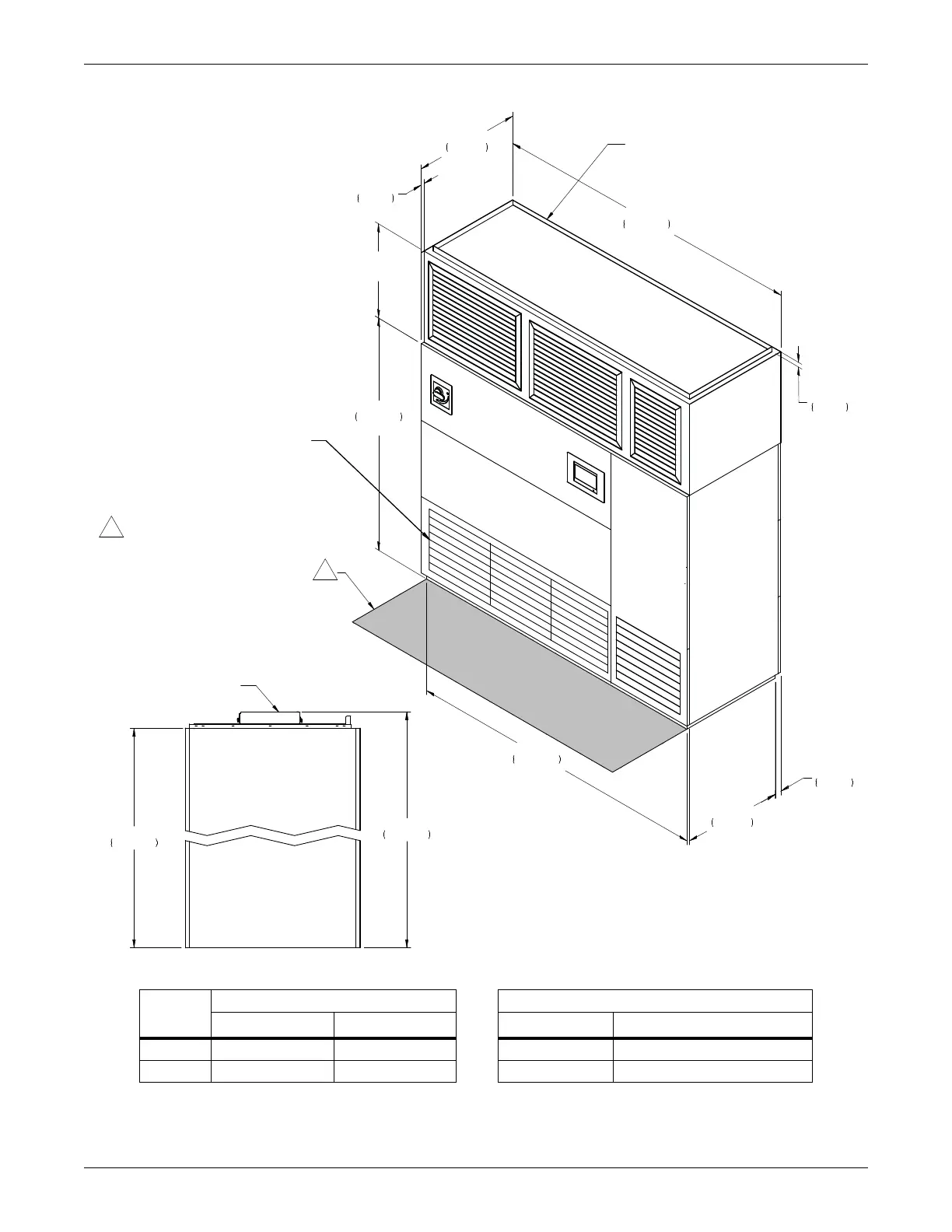 Figure 4-11 Cabinet and floor-planning dimensions, upflow, CW106, CW114 with EC fans, front return
