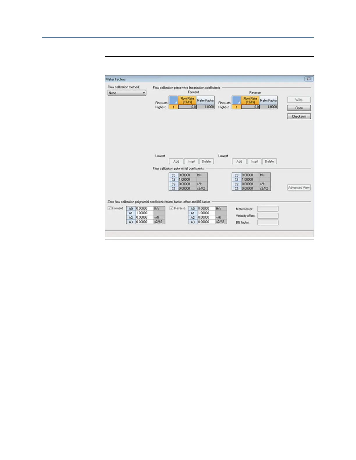 2. Click the Advanced View button to display the zero flow calibration polynomial