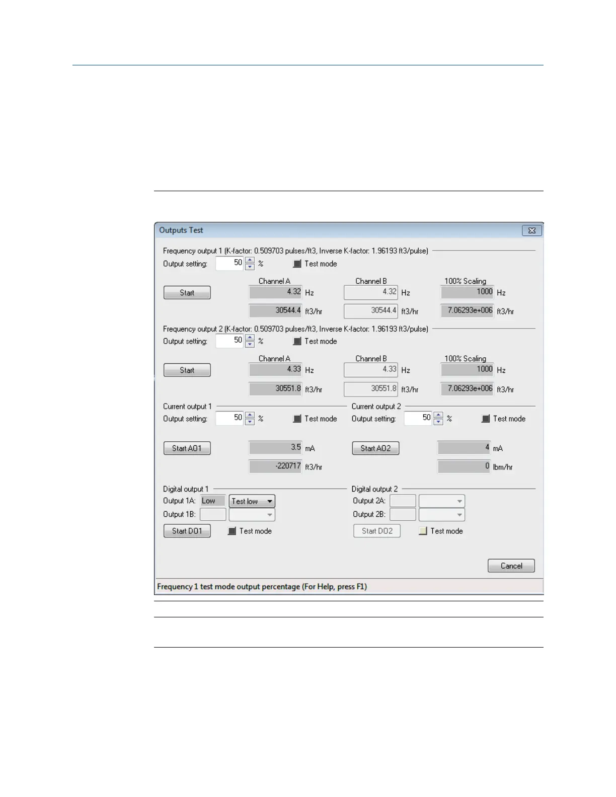 The Outputs Test dialog box allows you to monitor the live values of all the frequency,