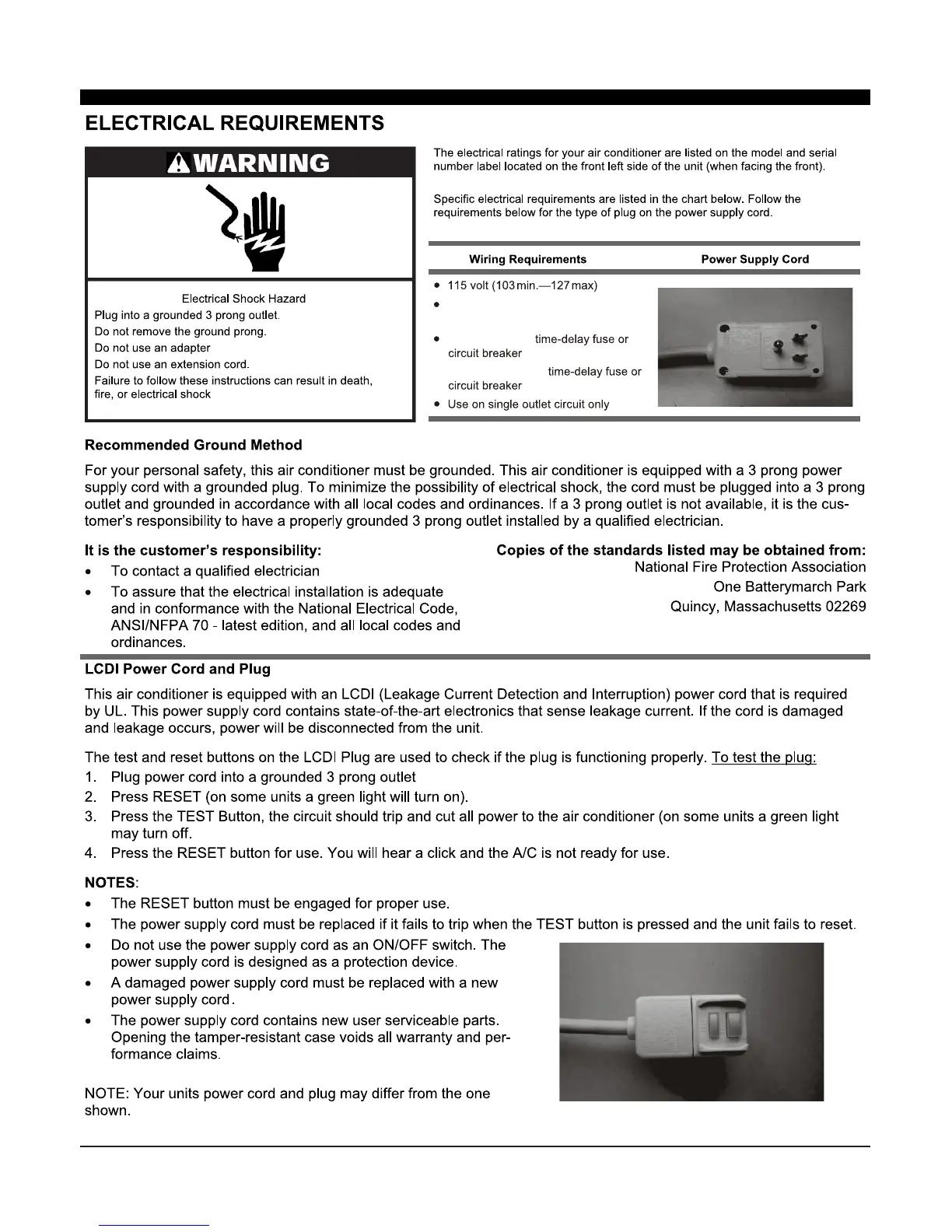 Emerson EARC8RE1 - Electrical Requirements; Electrical Shock Hazard Warning; Wiring, Power Cord, and Grounding; LCDI Power Cord Functionality