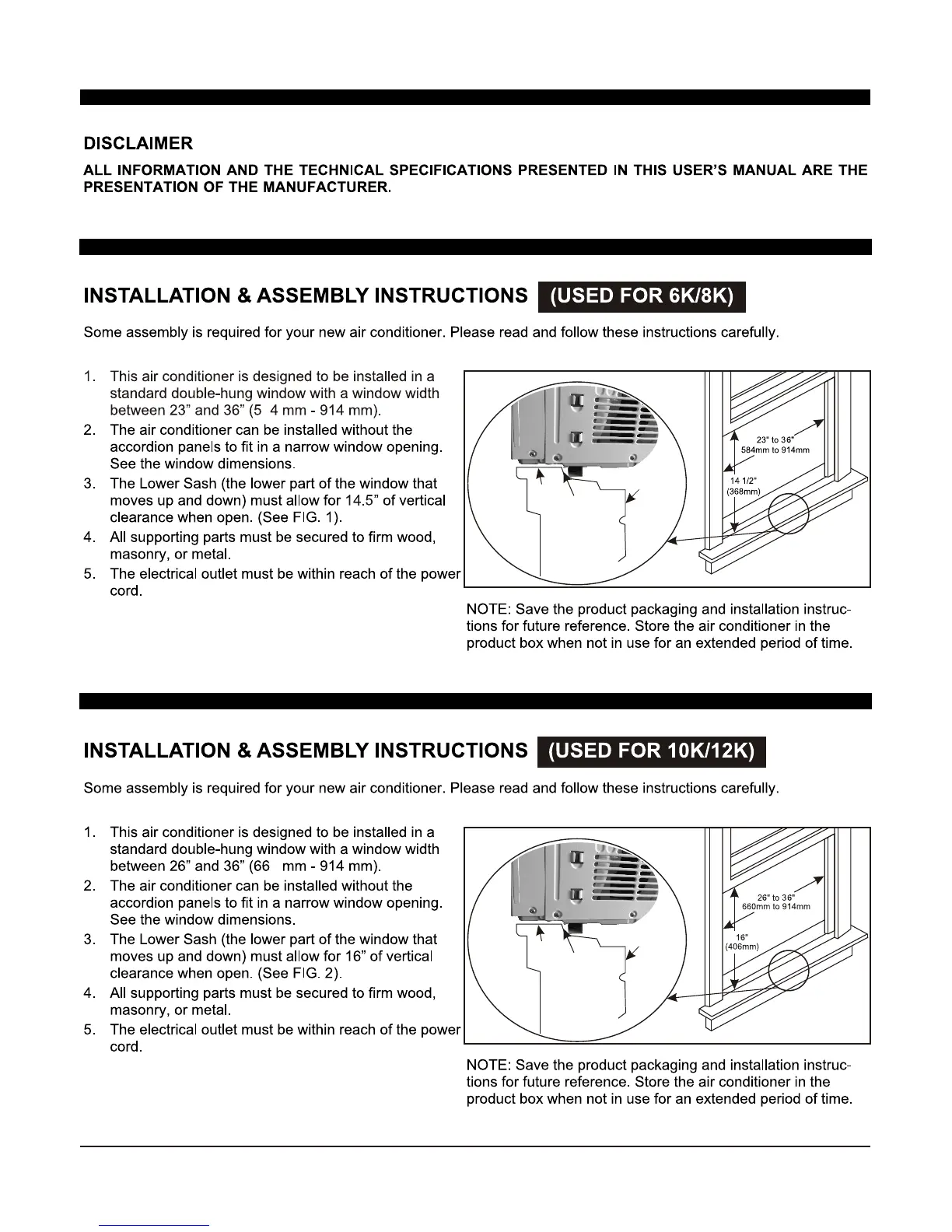 Emerson EARC8RE1 - Installation & Assembly for 6 K;8 K Models; Installation Requirements for 6 K;8 K Units; Installation & Assembly for 10 K;12 K Models; Installation Requirements for 10 K;12 K Units