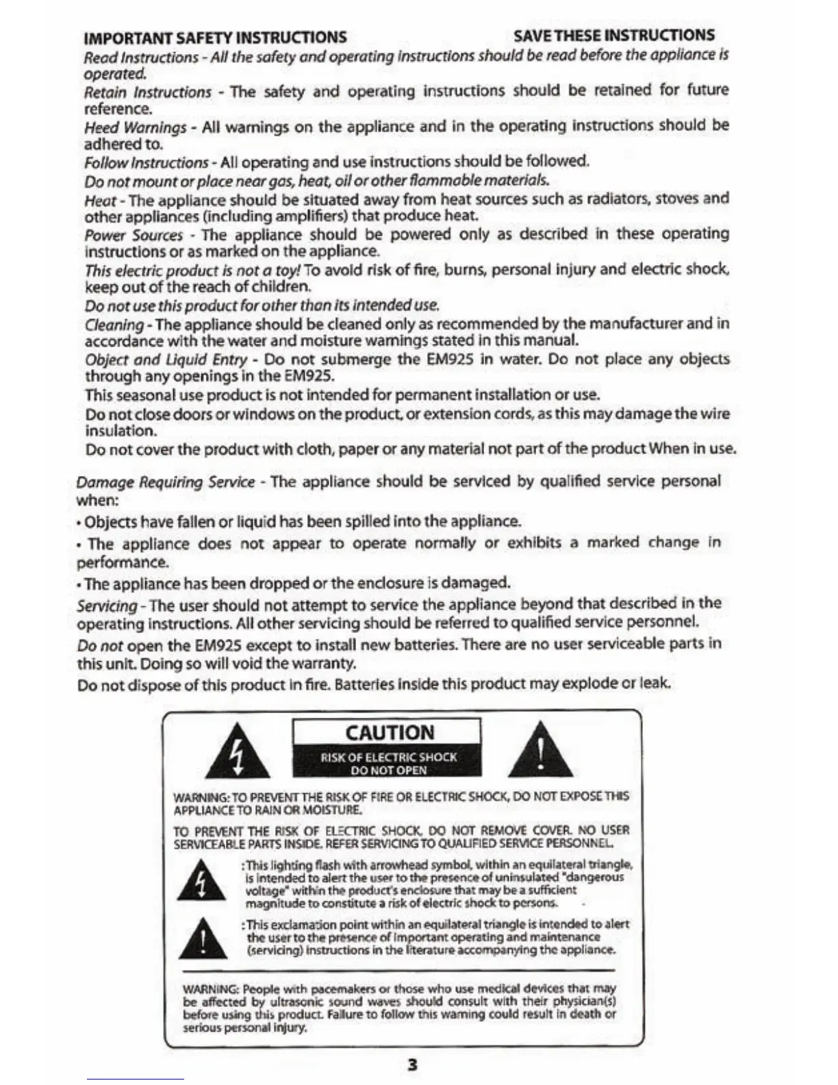 Emerson EM925 - Important Safety Instructions; General Safety Guidelines; Electrical and Environmental Safety; Product Usage, Care, and Servicing