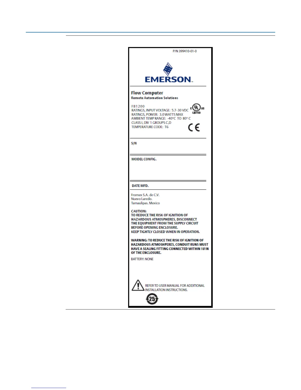 Figure B-1: Data Plate (No Battery) Class I Division 1 Explosion Proof (UL)