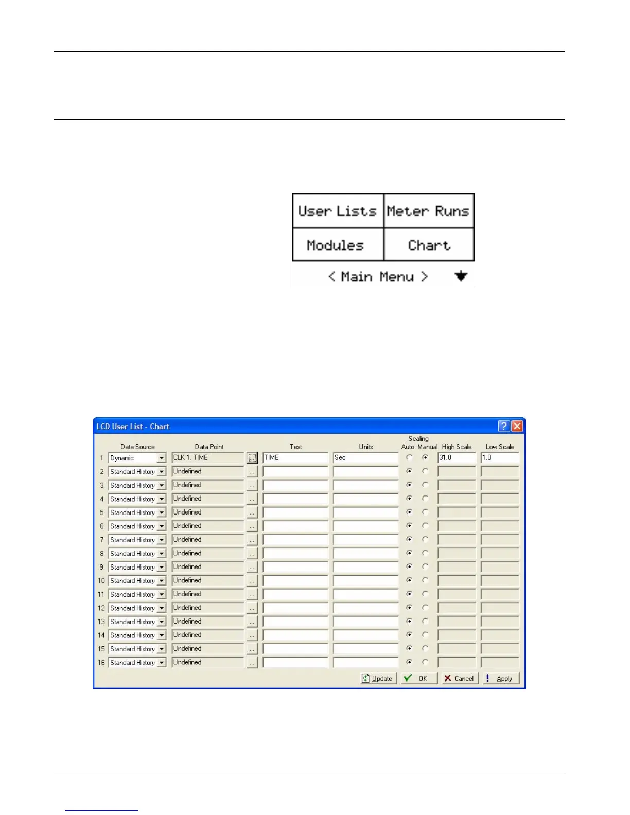 1. Select Configure > LCD User List > Chart from the ROCLINK