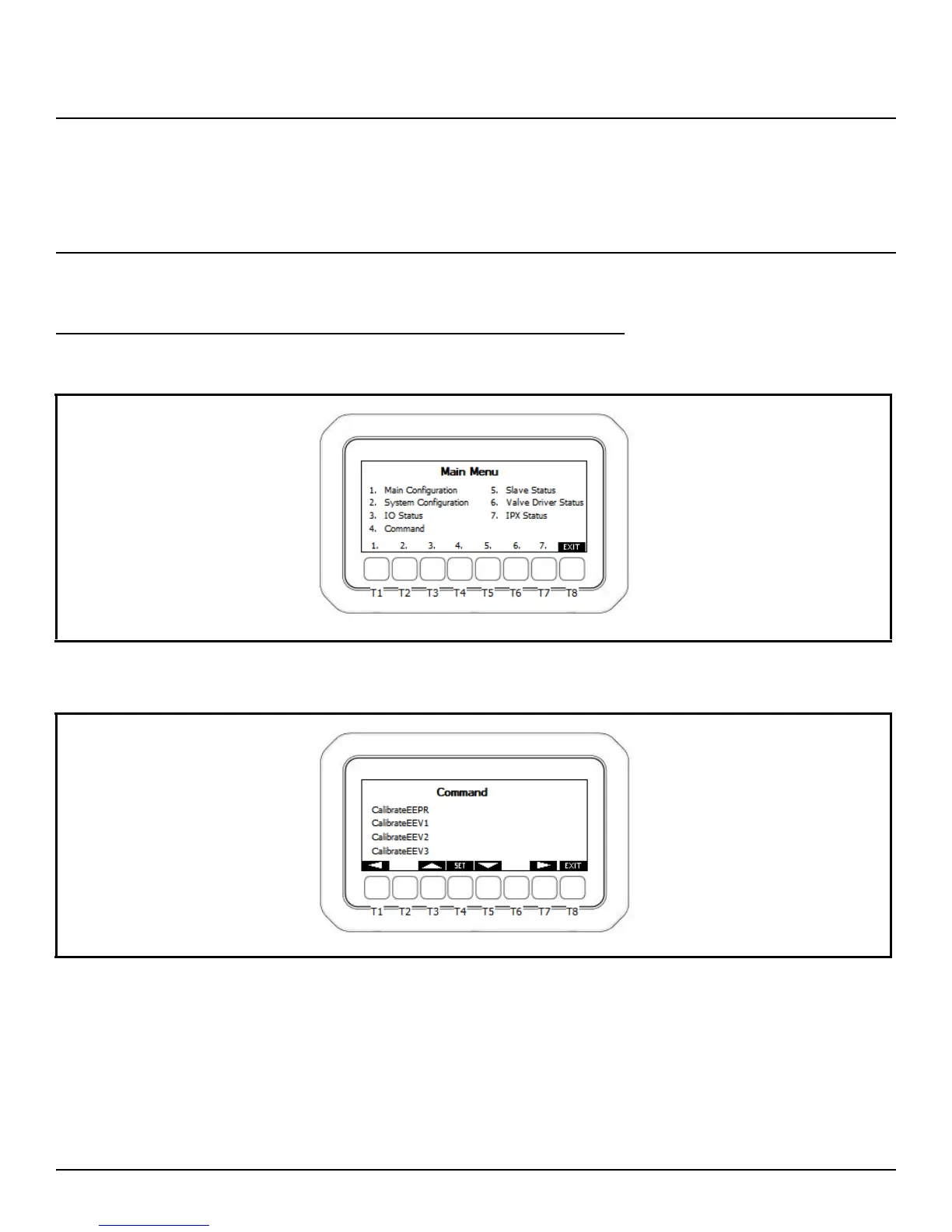 To calibrate electronic valves from the Visograph, press and hold the T4 key on the display for three (3) seconds to enter the Main Menu.