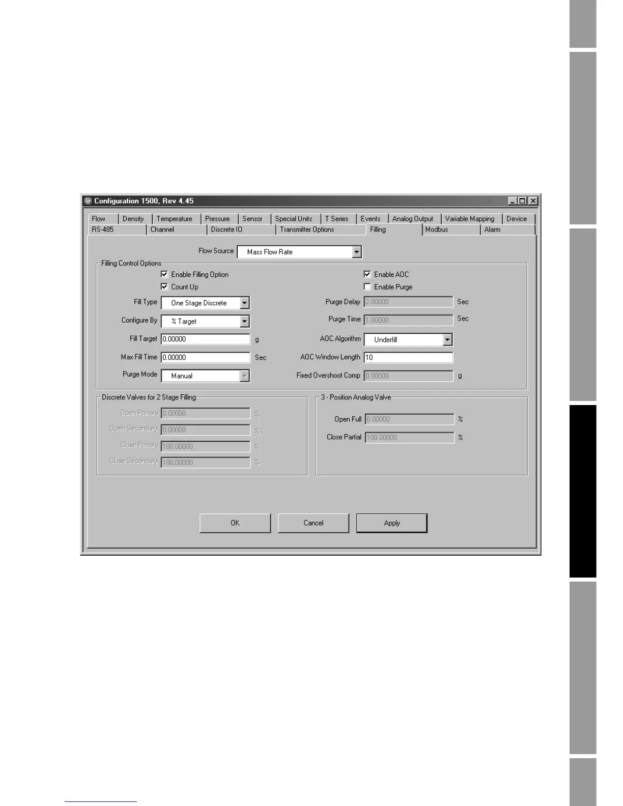 4. Configure transmitter outputs for the requirements of your filling application. Options are
