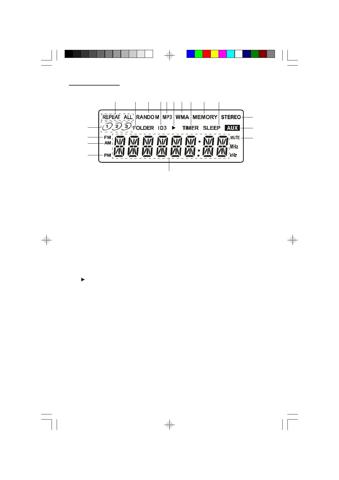 (Clock, Radio Frequencies, ID3, Tracks #, Folder #, Volume Level, Memories)