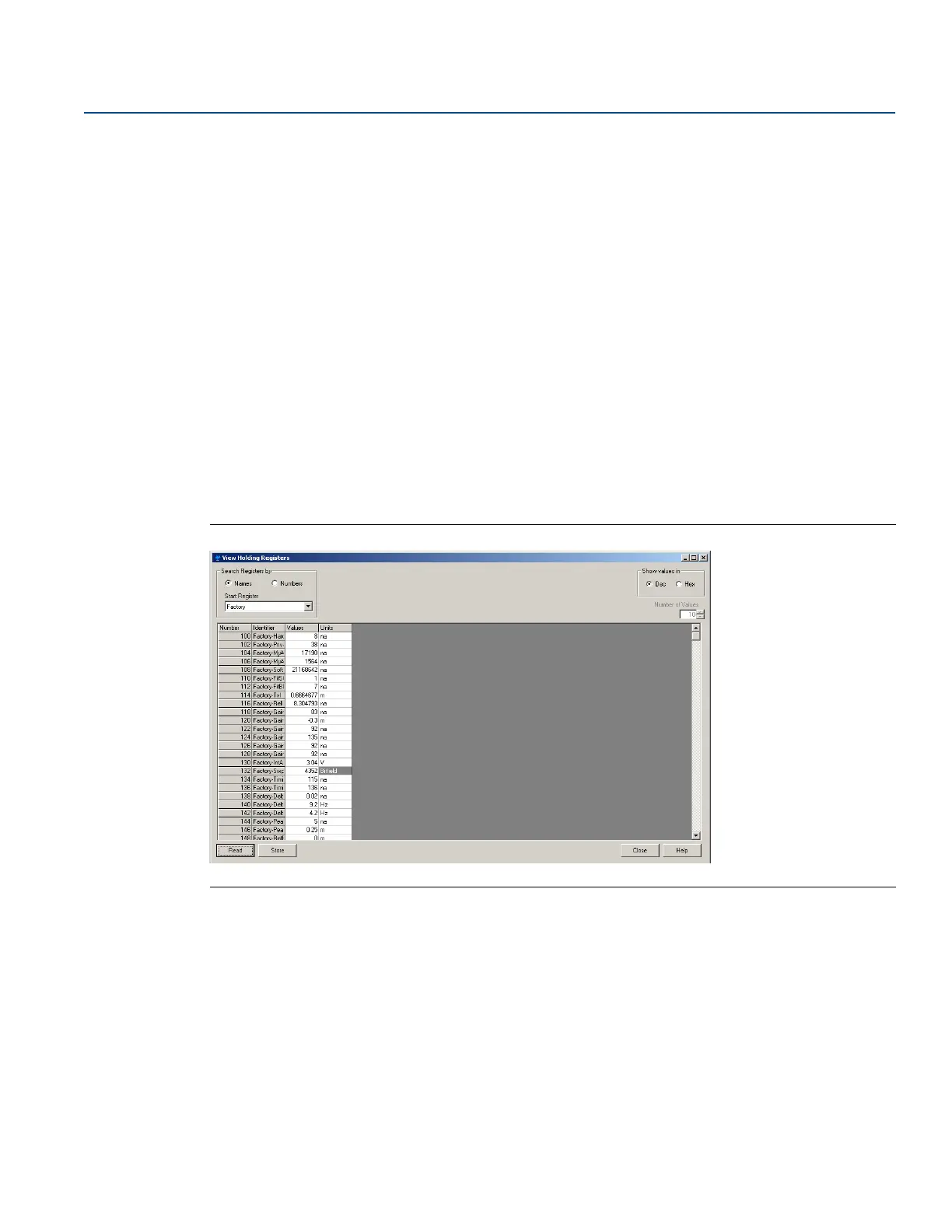 4. Select the Read button. To change a Holding register value, enter a new value in the corresponding