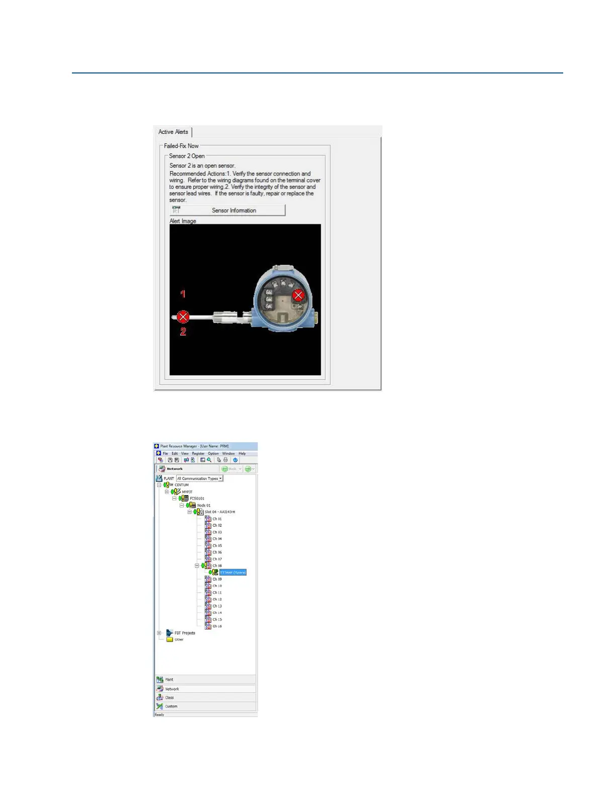status box. Another screen will display the active alerts indicating FAILED Sensor 2 Open, as