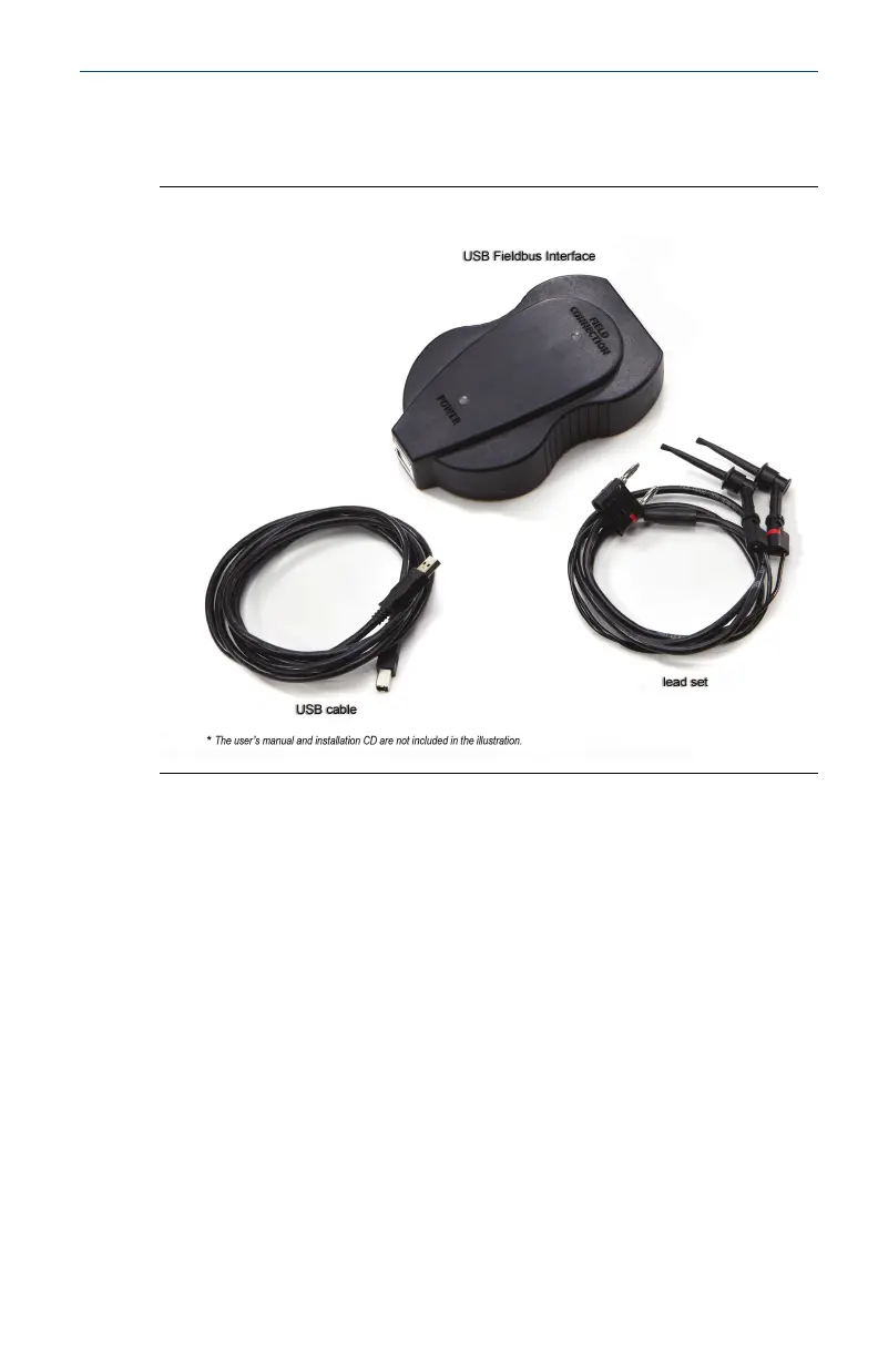 The USB Fieldbus Interface comes with a USB cable, lead set, user's manual*,