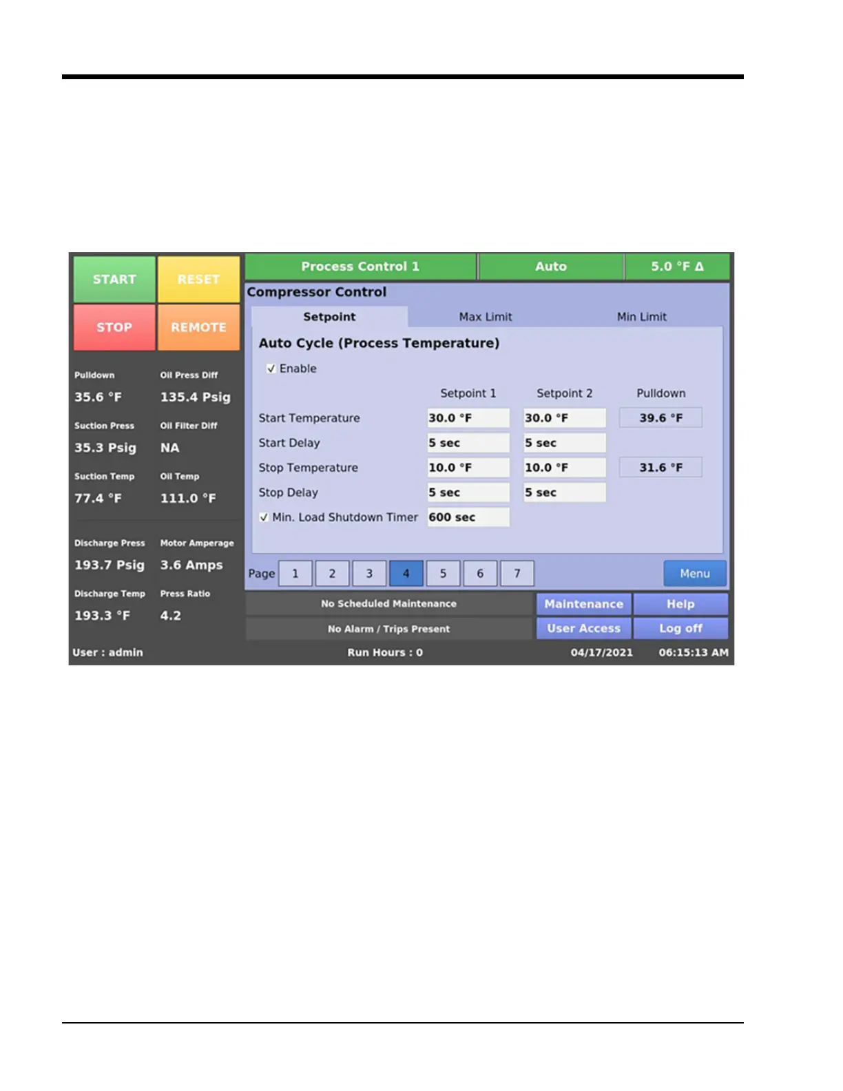 Figure 5-7. Compressor Control Screen – Auto Cycle (Process Temperature) with Pulldown