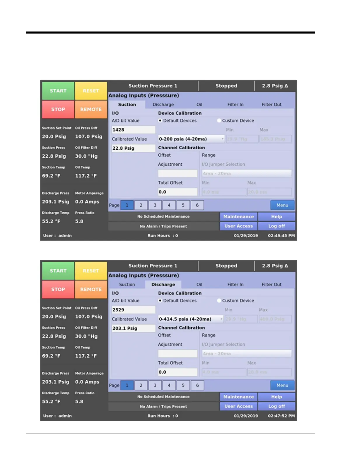 Figure 8-2. Instrument Calibration Screen Page 1 – Analog Inputs (Discharge Pressure)