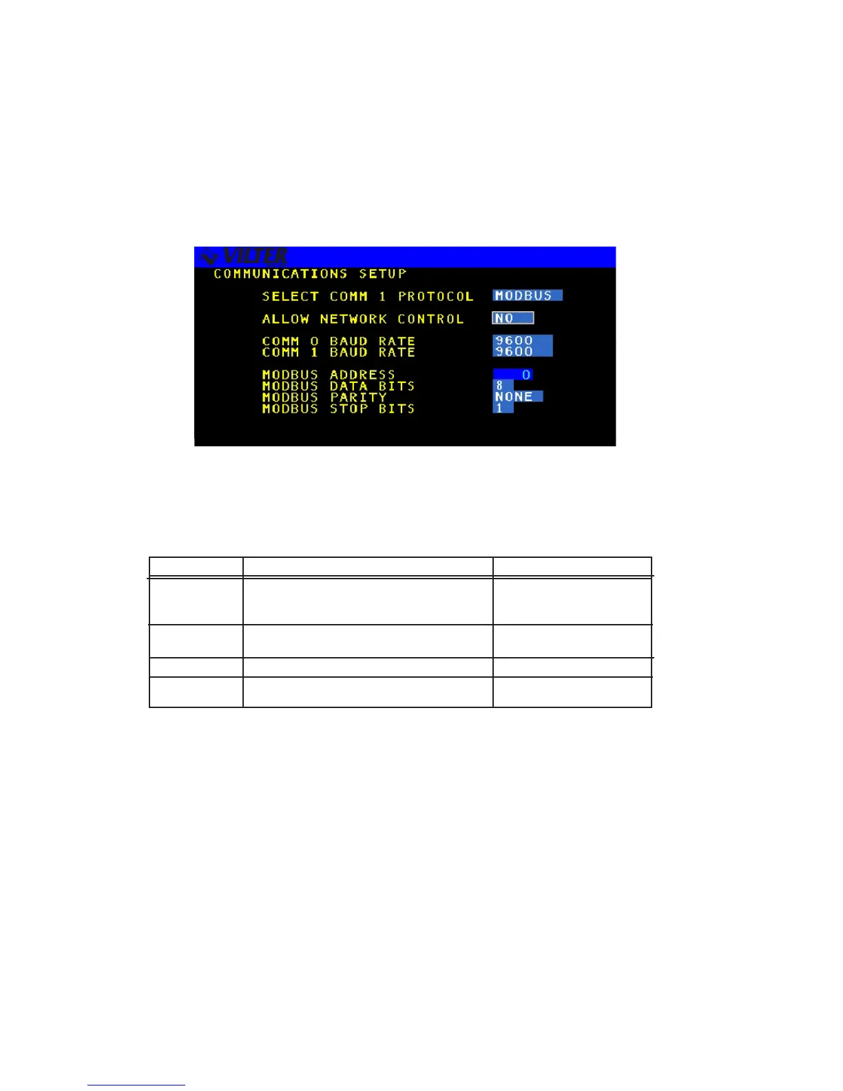 The following screen is a sample COMMUNICATIONS SET-UP screen for Modbus Commu-