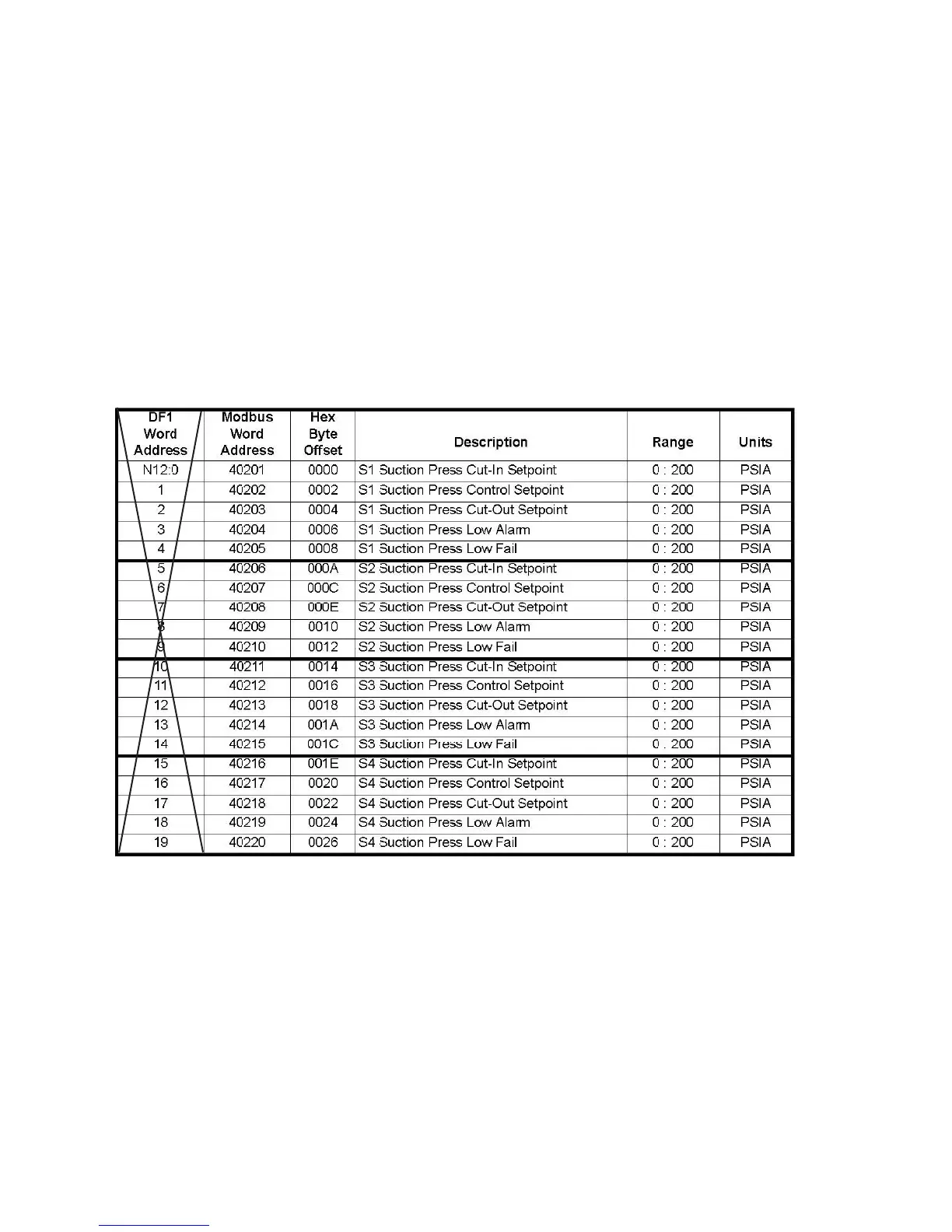 Suction Pressure control group setpoints. Suction Pressure setpoints may be read or written individually
