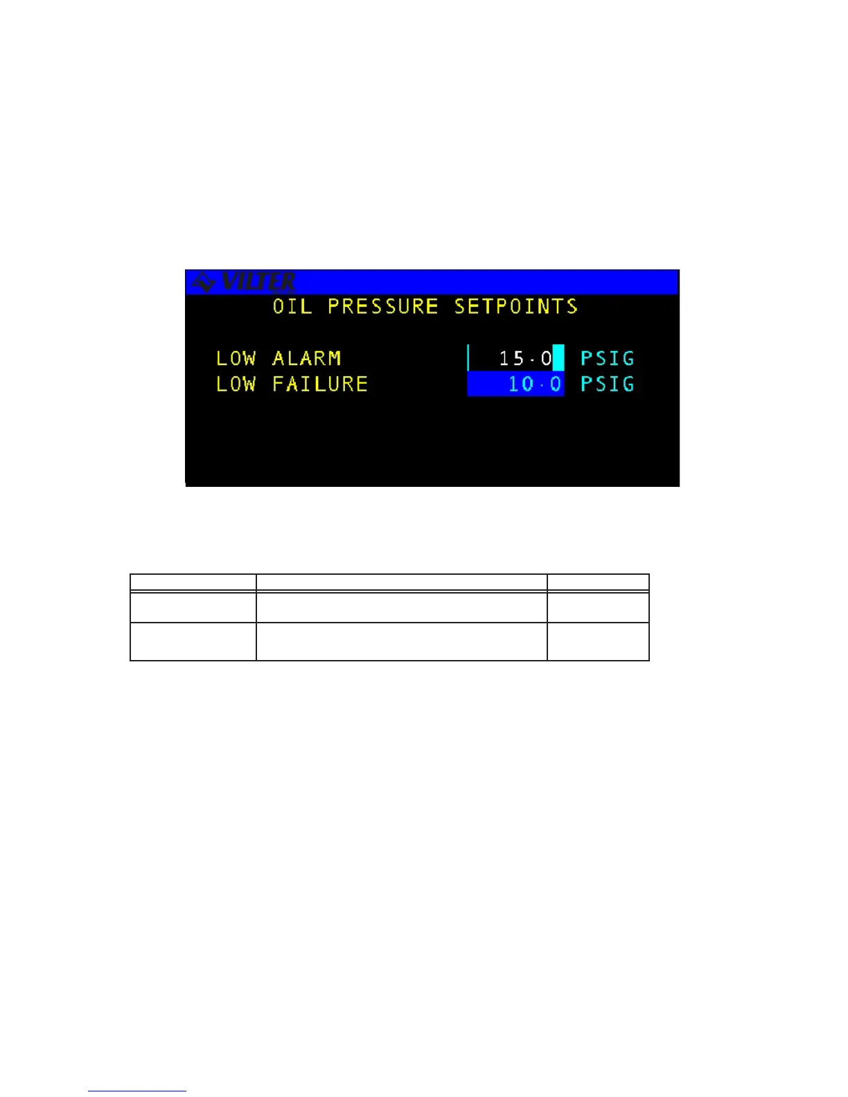 The OIL PRESSURE SETPOINTS screen allows the operator to set acceptable ranges for the oil pressure